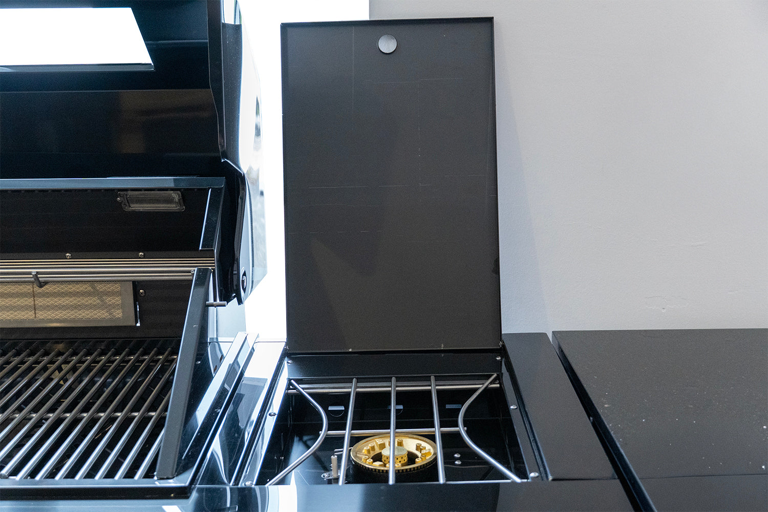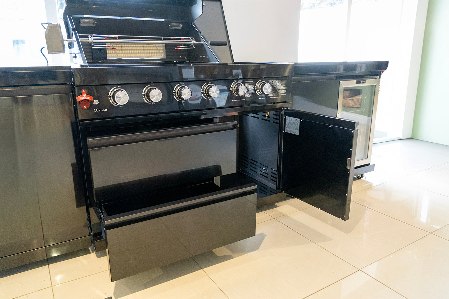 - This outdoor kitchen offers plenty of storage with 2 large compartments beneath the sink unit, 2 slide-out cabinets under the BBQ unit, a dedicated compartment for the gas tank, and an additional storage compartment next to the fridge.
